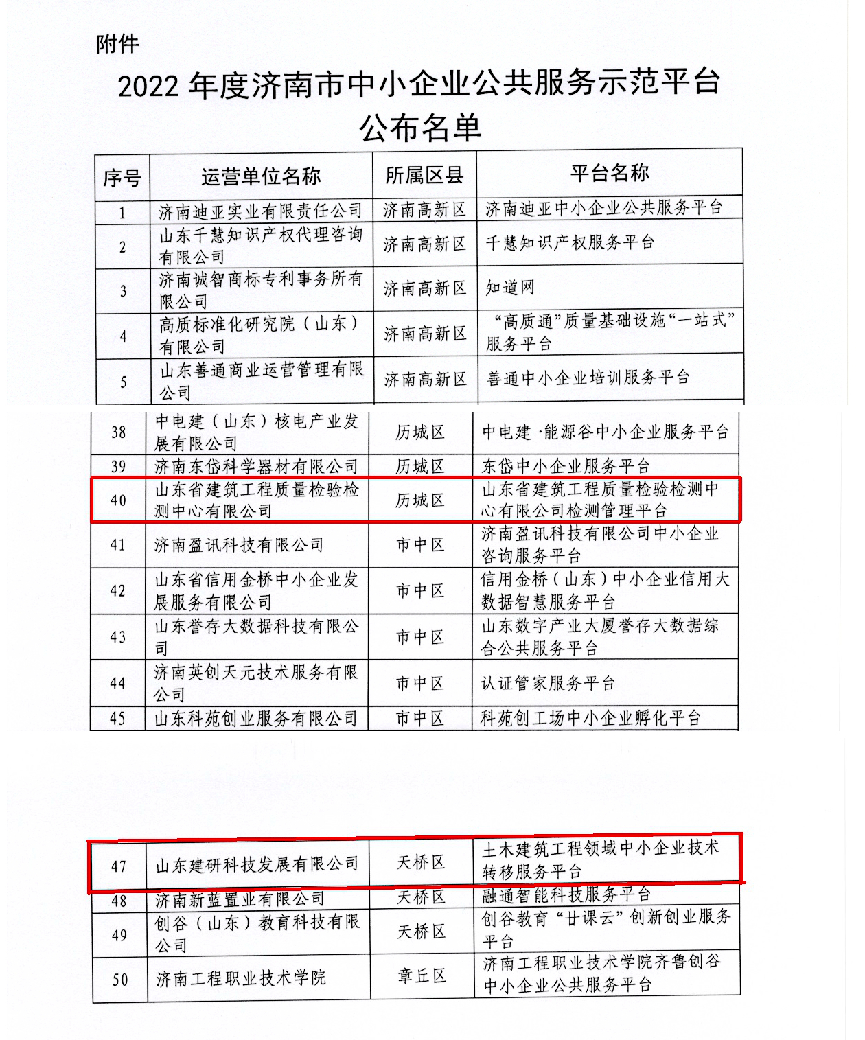3月31日,济南市工业和信息化局印发《关于公布2022年度市级中小企业公共服务示范平台的通知》,我院两个下属企业成功入选,分别为以山东省建筑工程质量检验检测中心有限公司为主体运营的“检测管理平台”、以山东建研科技发展有限公司为主体运营的“土木建筑工程领域中小企业技术转移服务平台”。